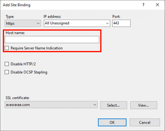 If you are serving more than one domain name from the same IP address, enter it in the Host name field and check the Require Server Name Indication box. If not, you can safely leave these blank.