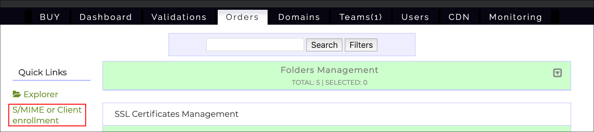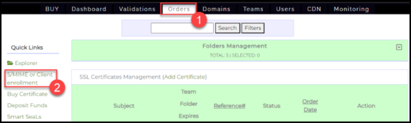 - Click the Orders tab Login to your SSL.com account, click the Orders tab, followed by the S/MIME or Client enrollment on the left sidebar.