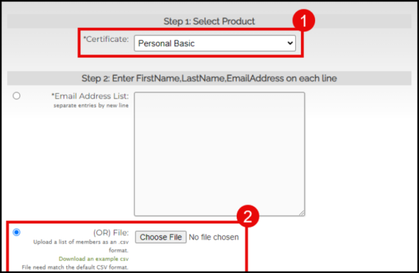 - Under the *Certificate option, click the drop-down arrow and select Personal Basic for a S/MIME certificate or NAESB Basic for a NAESB certificate. Next, click the radio button for the csv upload option and click the Choose File button to upload your csv file containing the bulk information required for your orders. The csv file should have columns for First Name, Last Name, Email, Country, and Csr (Certificate Signing Request). Fill out all columns except for Csr. For a templated csv file, click the Download an example csv link.