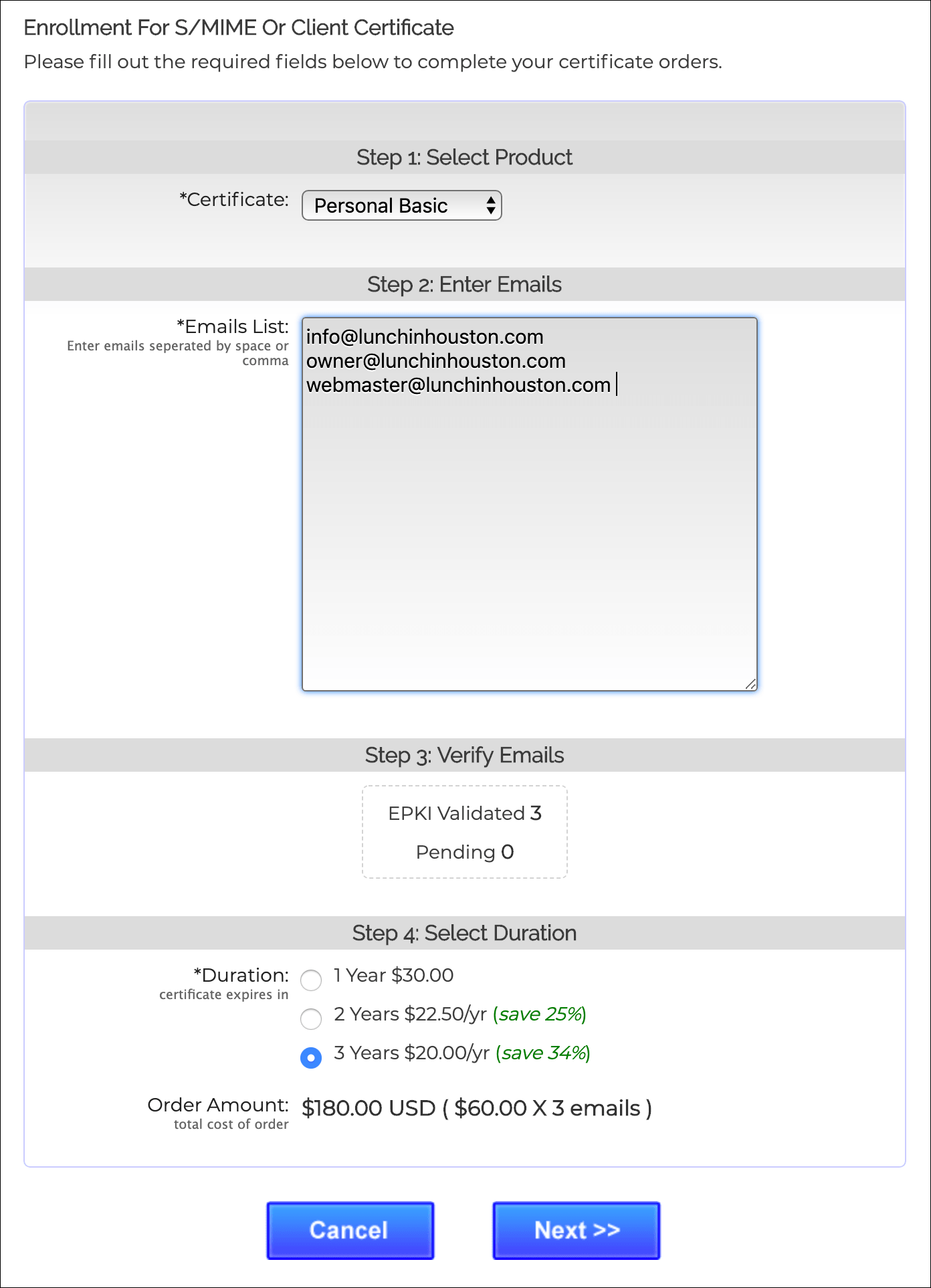 - On the Enrollment page that appears, select the type of certificates you want to issue from the drop-down menu. Then, enter a space- or comma-separated list of the email addresses you want to issue certificates for. Under Step 3: Verify Emails a counter will show the number of entered emails that are covered by your Bulk Ordering Identity Pre-Validation Agreement. Any that are not covered will be counted as Pending, and will be validated independently by SSL.com. Finally, select the duration of the certificates and click Next.