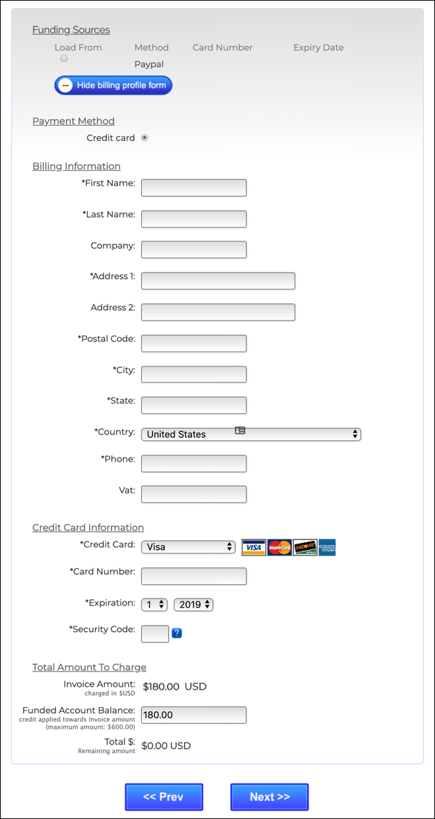 - Enter your billing information and click Next >> to pay your invoice via PayPal or credit card. If you have an existing account balance you can apply it to all or part of your invoice at the bottom of the screen.