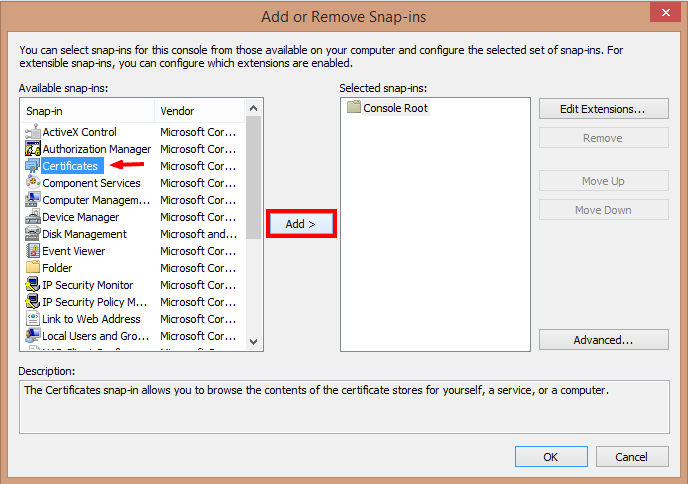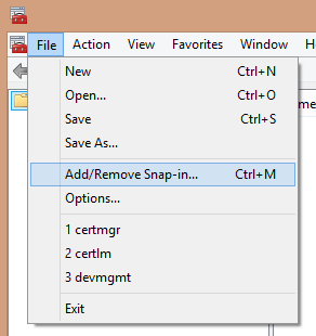 In MMC, select File > Add/Remove Snap-In (or type control-M).