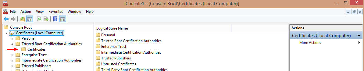 In MMC, click the arrow next to “Certificates (Local Computer)” to reveal the various certificate stores, then click the arrow next to your target certificate, and finally click the “Certificates” folder.