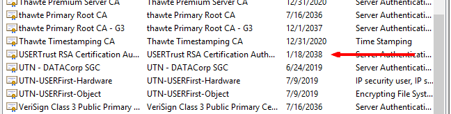 NOTE: In this example, we are disabling a self-signed certificate named “USERTrust RSA Certification Authority” in the root store, but the same steps can be used to disable the Superfish certificate – look for “Superfish” or “VisualDiscovery” in the target certificate. - In the list of certificates, look for your target entry (here, “USERTrust RSA Certification Authority”).