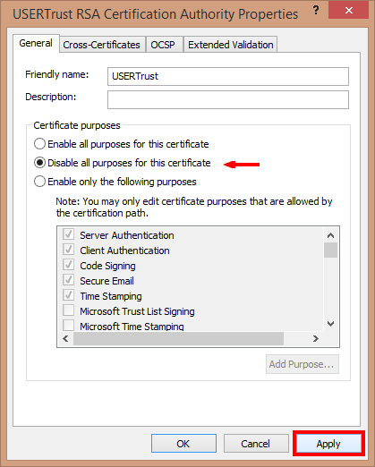In the Properties panel, select “Disable all purposes for this certificate”, then click Apply to implement the changes and OK to close the panel.