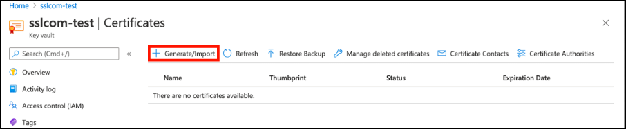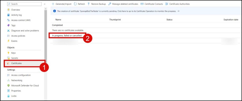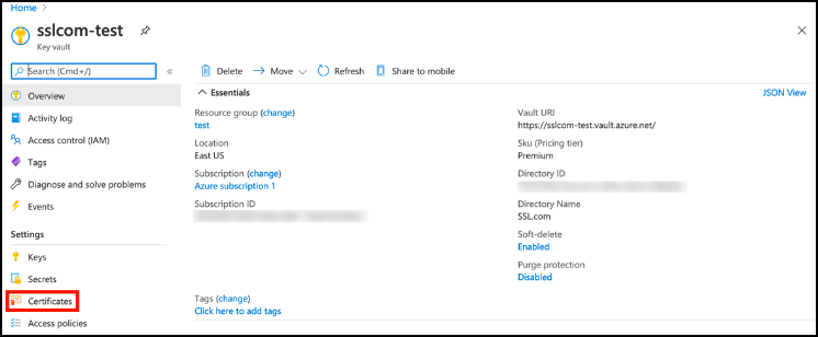 - Select your key vault and click Certificates.