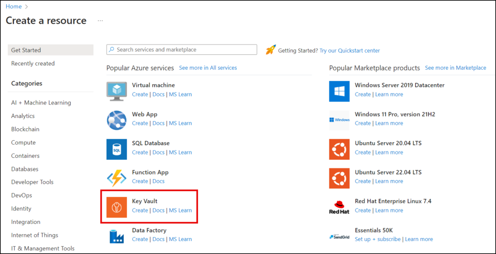 - Scroll to Key Vault and click the Create link.