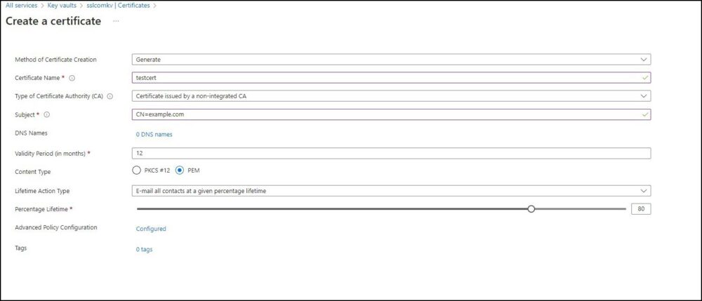 - Lifetime Action Type: Configure Azure to send email alerts based on a certain percentage of the certificate’s lifetime or a specific number of days before expiration.