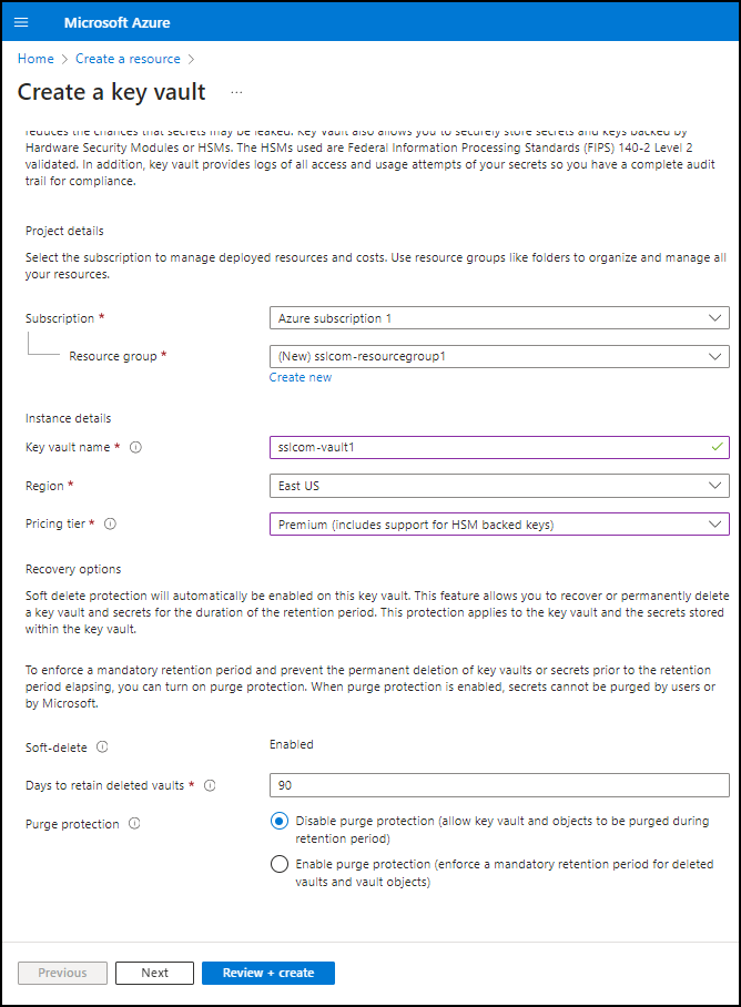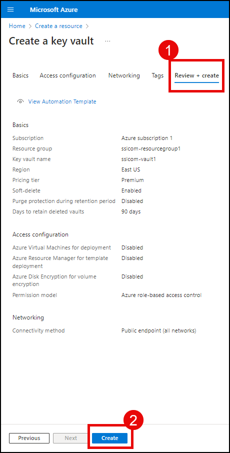 - Continue to Review + create. Review your settings, then click the Create button to create your new Key Vault.