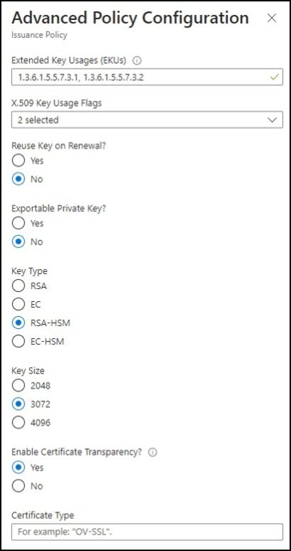 - For certificates issued by SSL.com, you can leave Extended Key Usages (EKUs), X.509 Key Usage Flags, and Enable Certificate Transparency at their default values.