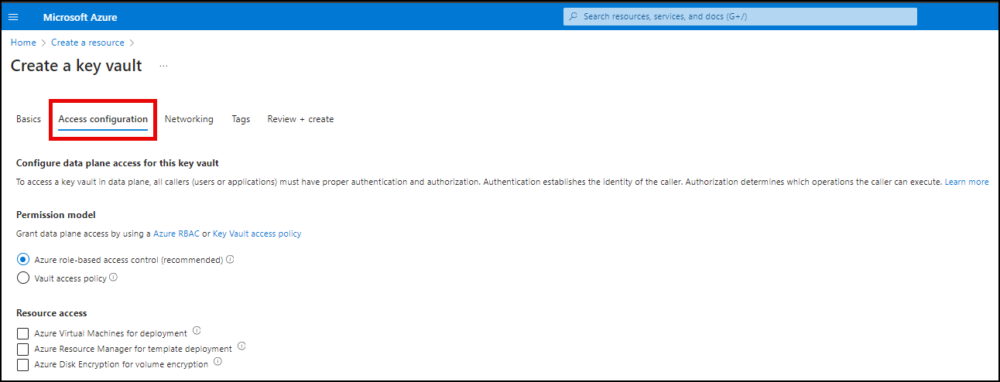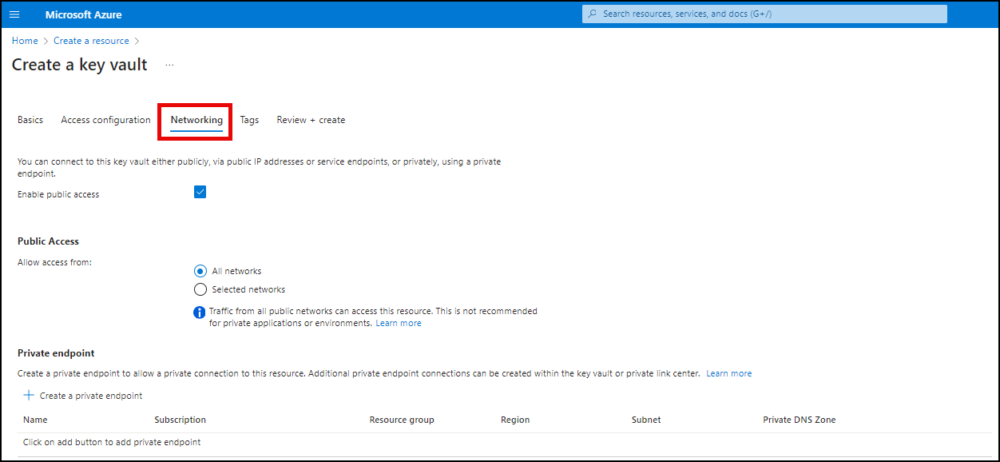 - Click Networking. Choose a connectivity method for your Key Vault.