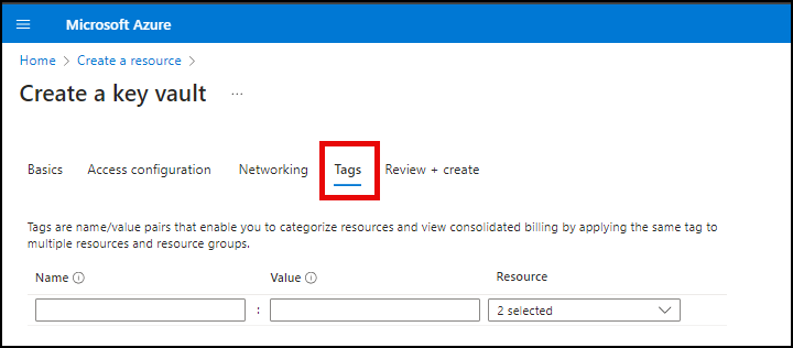 - Click Tags. If desired, create tags for your Key Vault.