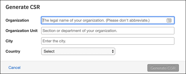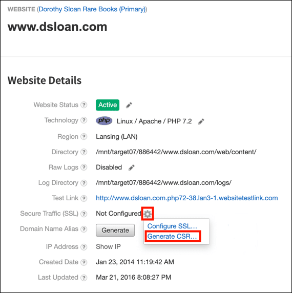 3. Click the gear icon at the right side of the line labeled Secure Traffic (SSL), then click Generate CSR…