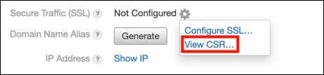 8. To view the CSR, click the gear icon at the right side of the line labeled Secure Traffic (SSL), then click View CSR…