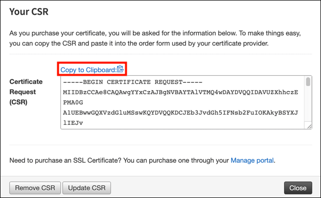 9. When you are ready to submit your CSR to SSL.com for validation, click the Copy to Clipboard link. For instructions on submitting your CSR to SSL.com, please read our guide to CSR submission. When you are ready to install your signed certificate, please check our how-to on certificate installation in Liquid Web Cloud Sites.