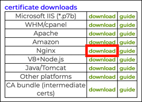 - Download your certificate from SSL.com. Choose the download link for Nginx. The downloaded file should end with