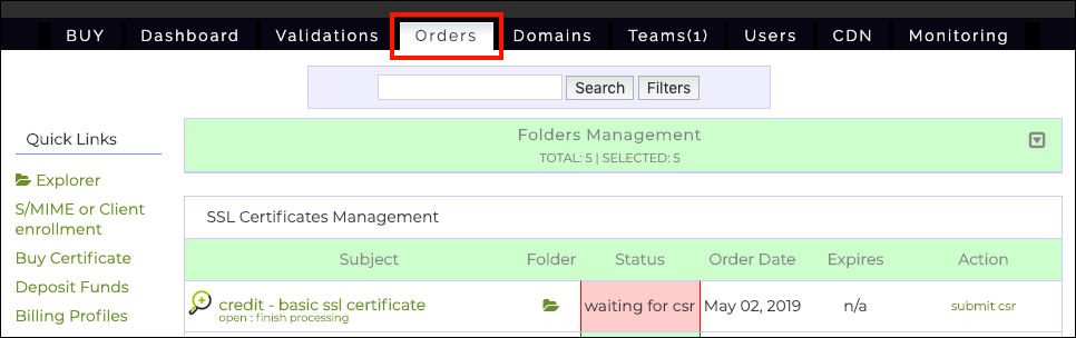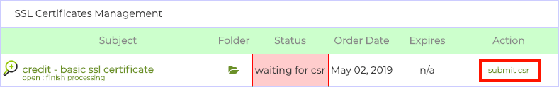 - Find the order you wish to generate a CSR for and click the submit csr link, located in the Action column.