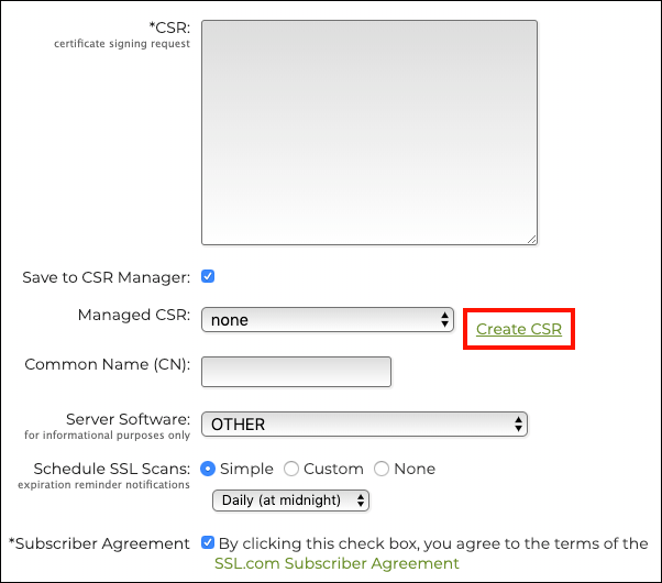 - Scroll down the page that opens to the CSR form and click the Create CSR link.