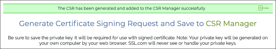 - A green status alert will appear at the top of the page indicating that your CSR has been generated successfully and saved to CSR Manager.