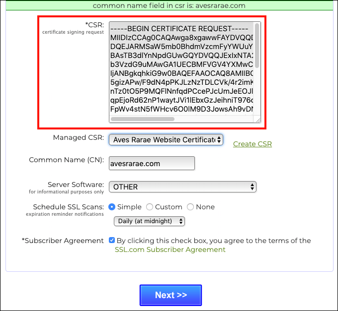 - You can now make any other desired changes to the form (such as scheduling SSL scans) and continue with your order by clicking the Next>> button. Please see our How-to on Ordering and Retrieving SSL/TLS Certificates for a complete overview of the certificate ordering and validation process.