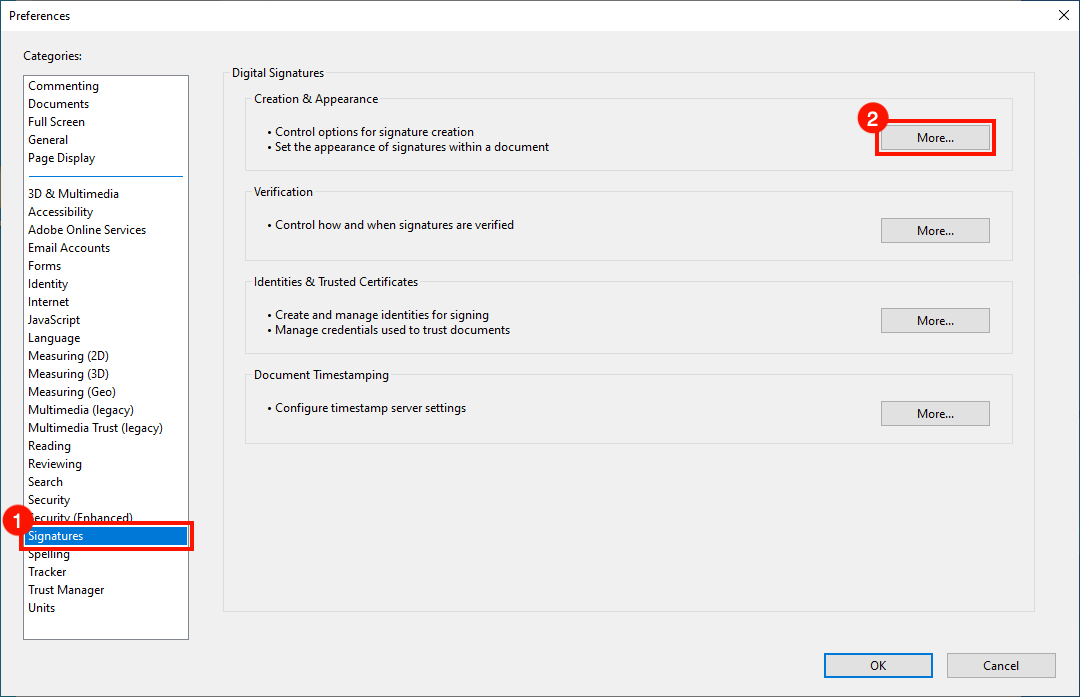 2. Select Signatures, then click the More button under Creation & Appearance.