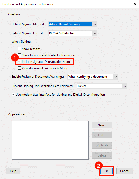 3. Make sure the check-box labeled Include signature’s revocation status is checked, then click the OK button to close the dialog box.