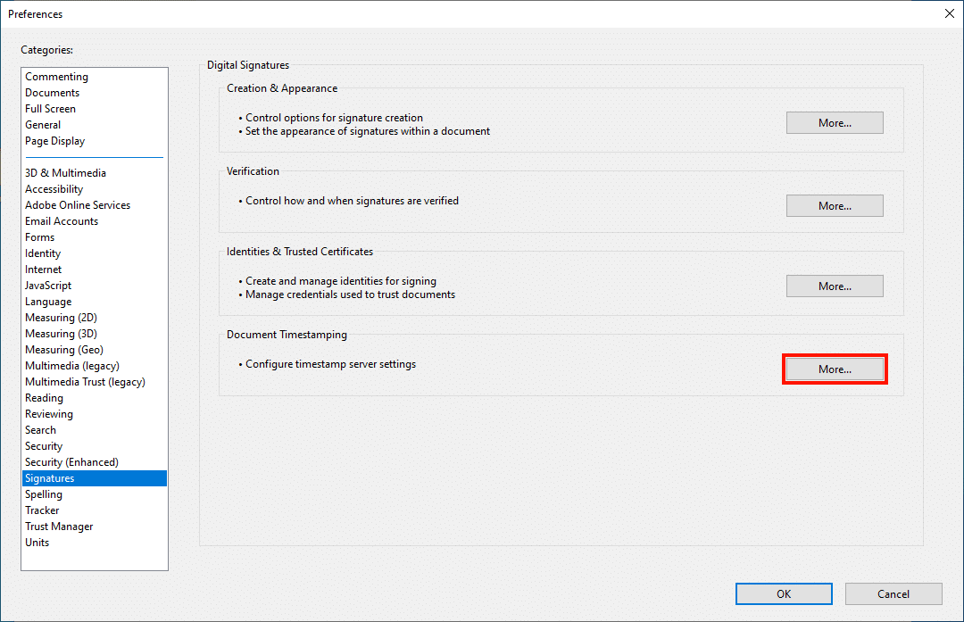 4. Now we will configure the time stamp server. With the Signatures preferences still open, click the More button, under Document Timestamping.