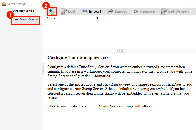 5. Select Time Stamp Servers in the left-hand menu, then click the button labeled +, with an icon of a computer.
