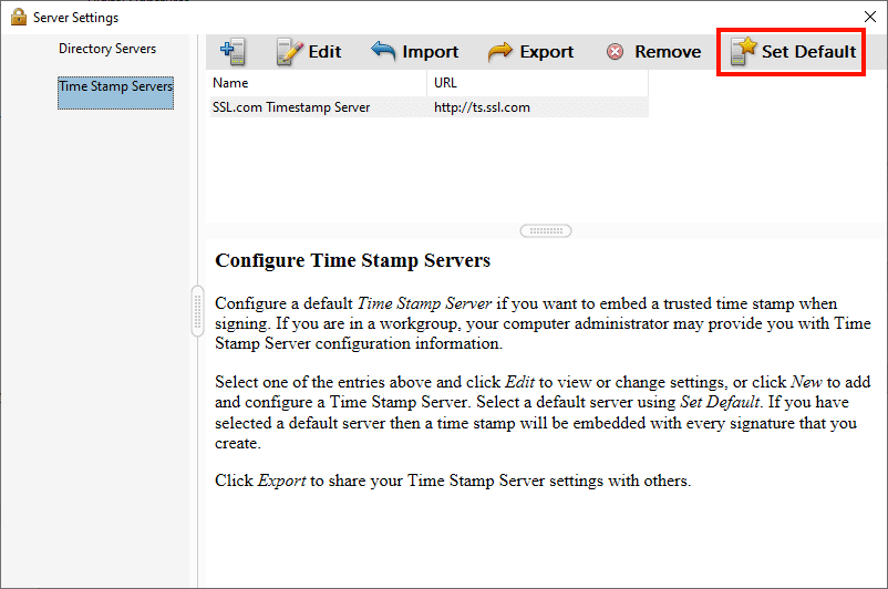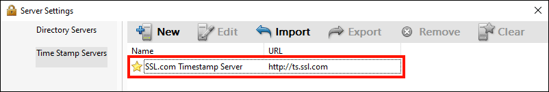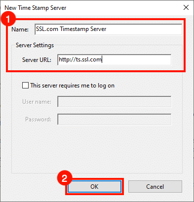 6. Enter a Name and URL for a time stamp server, then click the OK button. Here we are using SSL.com’s server at http://ts.ssl.com.
