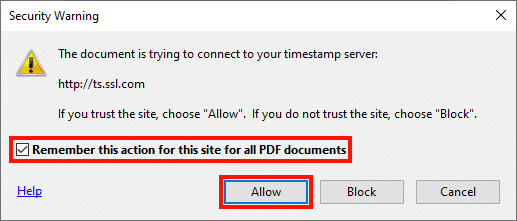 The first time you connect to a new time stamp server when signing, Acrobat will present a security warning dialog. Click Allow to continue. You can also check the box labeled Remember this action for this site for all PDF documents to prevent the dialog from appearing in the future.