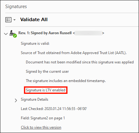 6. Following the steps above under Check the LTV Status of a Signature, you can now confirm that the signature is LTV enabled.