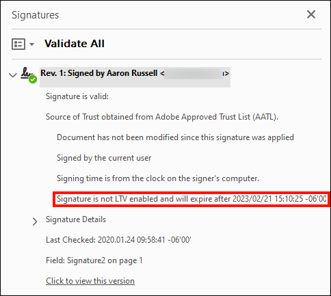 4. If the signature is not LTV enabled, this line will read “Signature is not LTV enabled,” followed by an expiration date.
