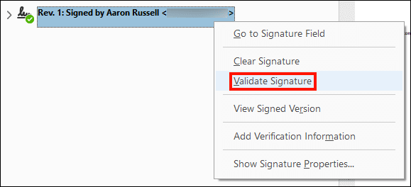4. To check if all necessary LTV information has been added to the signature, right click the signature and select Validate Signature from the menu.