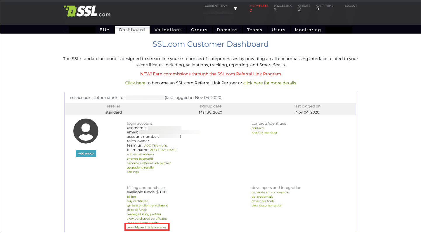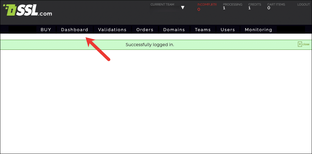 - After logging into your SSL.com account, navigate to the Dashboard.