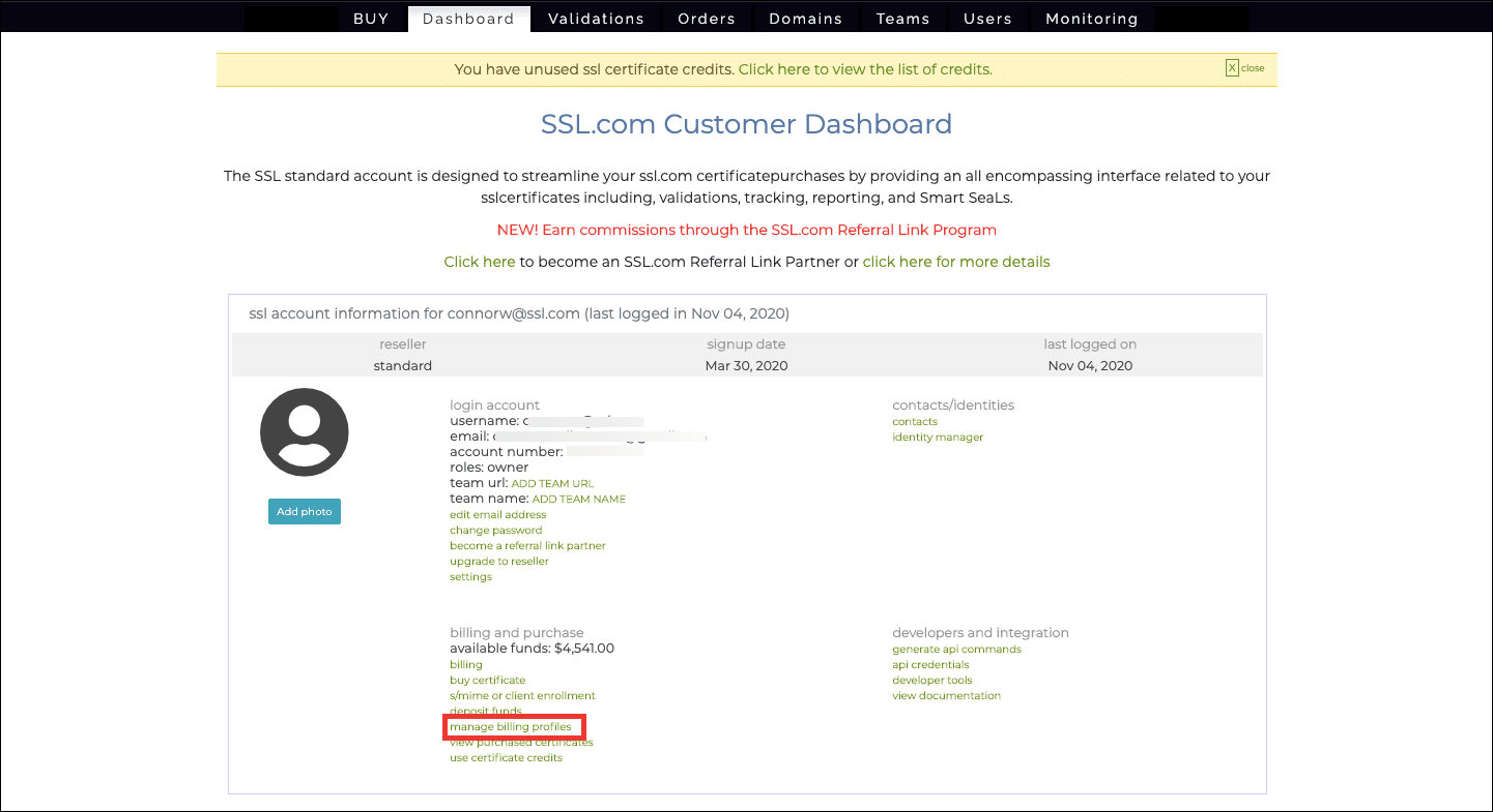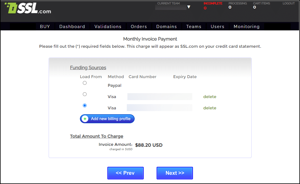 If you have an unpaid invoice with SSL.com, you can access the invoice through your account and make a payment using the billing profile you’ve added.