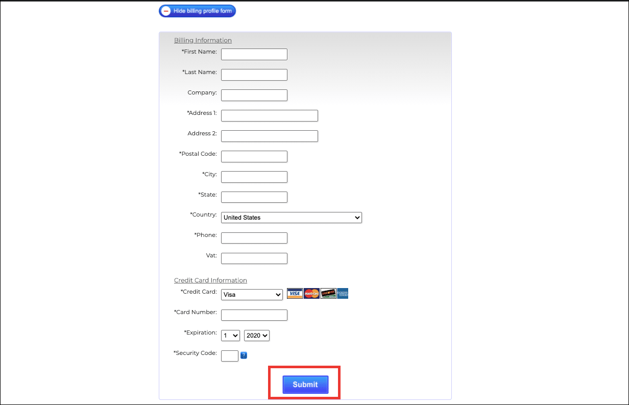 - Click the Add new billing profile dropdown, and add your information to the form. Click the Submit button when you are finished.
