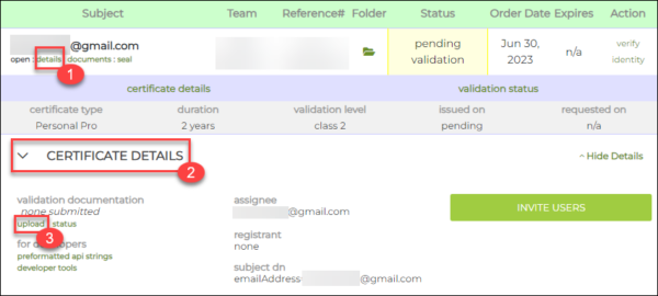 Click the details link on your order followed by the CERTIFICATE DETAILS section. Next, click the upload link. For IV S/MIME certificates, please upload images of the following:
