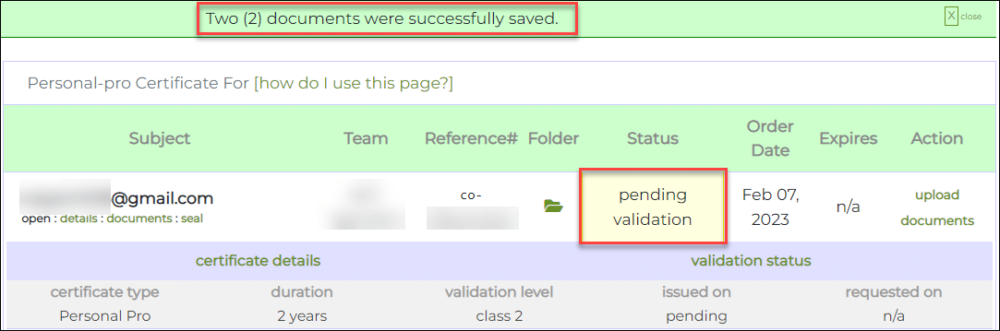 You will be returned to your certificate order page. There should be a green alert at the top of the screen indicating that your documents were successfully uploaded. Note that your order will have the status of pending validation until the information you submitted has been validated.