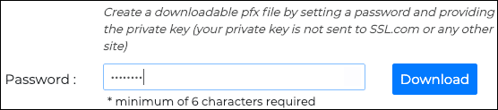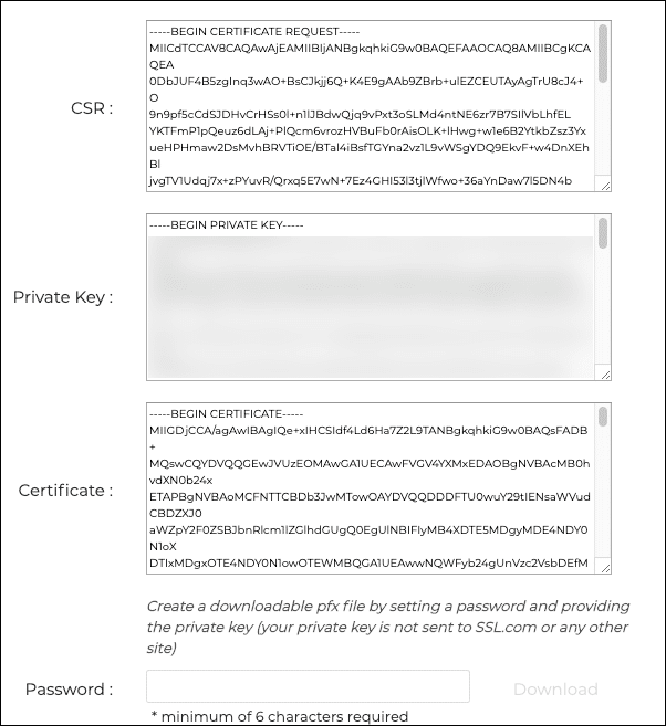 - To download a PFX file containing your new certificate and private key to your computer, create a password of 6 characters or more, then click the Download button. Remember this password. You will need it when you install the certificate and key on your computer. Also, it is very important that you keep your private key secure and do not lose it. SSL.com does not ever see or handle your private keys and cannot help you recover a lost key (it will be generated in your browser, on your own computer). Without your private key you will not be able to digitally sign email or read email that has been encrypted with your public key. Even worse, anyone with your private key will be able to assume your identity for signing email messages and client authentication.