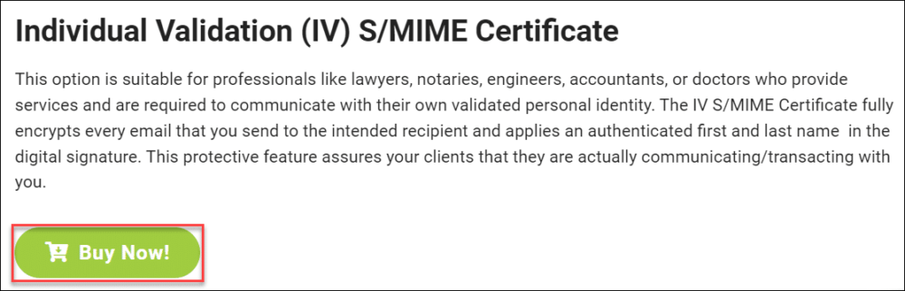 - Go to the product page for IV S/MIME certificate and click the Buy Now button.