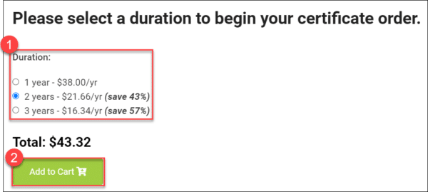 - Choose a duration for your certificate and click the Add to Cart button to add the certificate to your shopping cart. Note that even though the maximum lifespan of any S/MIME certificate issued by SSL.com is two years, customers can save money by ordering bundles of up to three years. For three-year Individual Validation S/MIME Certificate orders, we issue free replacement certificates upon expiration and re-validation for the final year of the order.