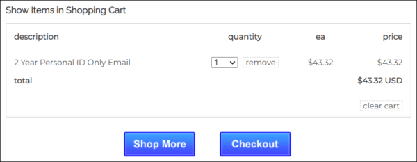 - In the shopping cart, you can change the quantity of certificates, remove them from your cart, or return to shopping with the Shop More button. When your order is complete and correct, click Checkout.