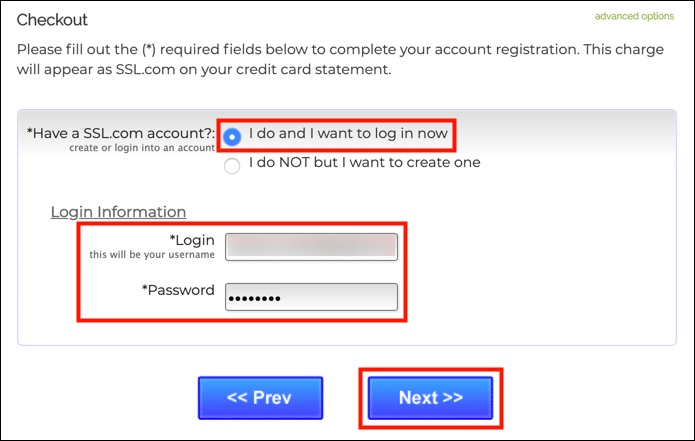 - If you are not already logged into your SSL.com account or do not have an account yet, you will be prompted to login or create a new account at the Checkout screen. If you have an account, select I do and I want to log in now, enter your username and password, then click the Next >> button.