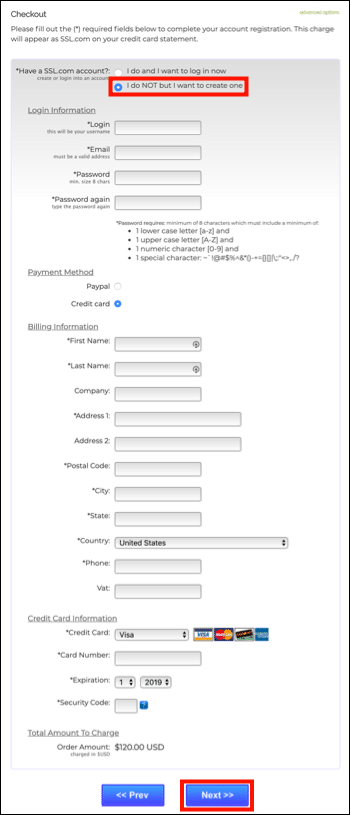 - If you do not have an SSL.com account, select I do NOT but I want to create one, fill in the requested information (username, email address, password, and billing information), then click the Next >> button.