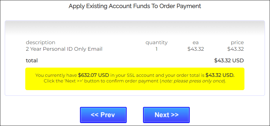 - If your account contains existing funds, they will be applied to your purchase. If your account does not contain sufficient funds, you will be prompted to add more. Click the Next >> button when your account has sufficient funds to complete the transaction.