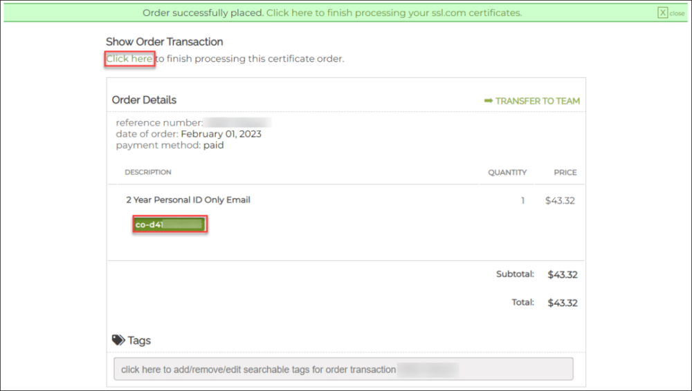 - If your order has been successfully placed, you will see a green alert near the top of the browser window, reading “Order successfully placed…” Click the Click here link under Show Order Transaction or the green order number beginning with “co-” in the order details.