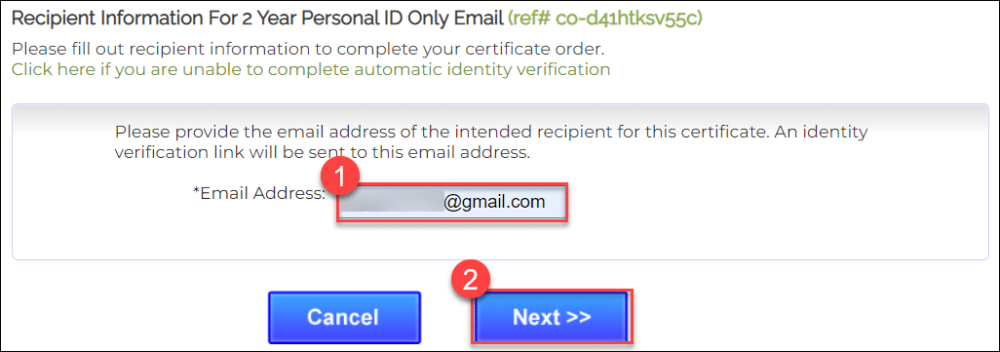 - Enter recipient your email address for recipient information. SSL.com will use your email address to send you updates regarding your order. then Proceed to click the Next>> button.