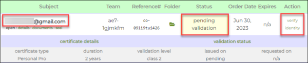 - On the orders tab of your account, you will then be shown the details of your newly-created order. Under the Action column, the text verify identity will be displayed. Under the Subject column, the email address you placed in the previous step will appear. Once you have validated your identity, the Subject column will display your personal name.