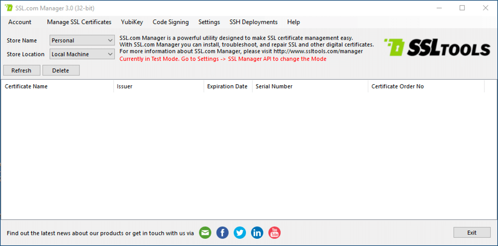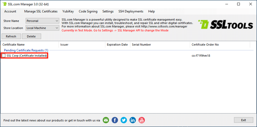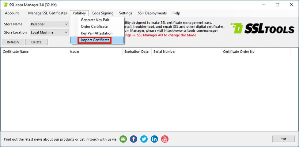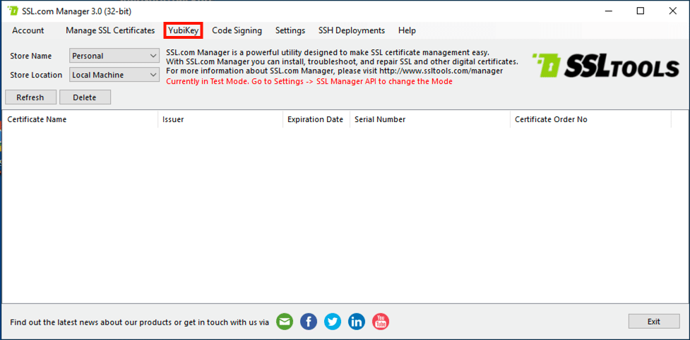25. You will be returned to the SSL Manager window. Note that, unlike with the automated process, manual orders do not appear in the application window. However, the certificate is installed on the YubiKey.