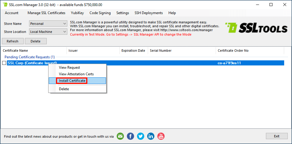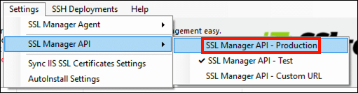Note that in this how-to, the screenshots show SSL Manager in test mode because we are working the SSL.com sandbox to create test order. To create live orders (and spend real money), You can set SSL Manager to production mode by selecting Settings > SSL Manager API > SSL Manager API – Production in the menu.